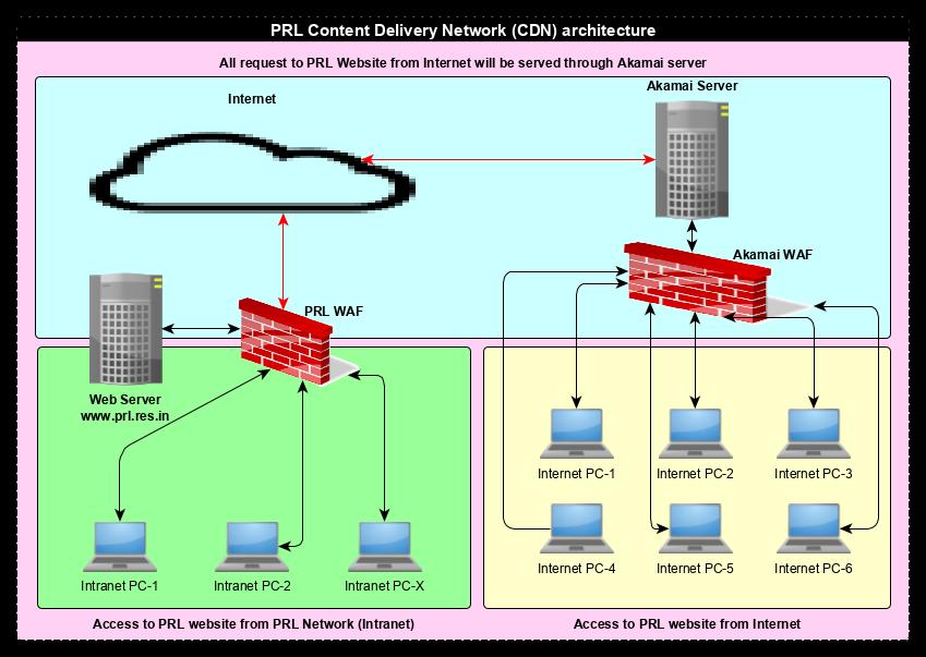We moved the PRL website on the Content Delivery Network (CDN) in 2019. The CDN not only provides security to the website but also gives faster access to the website across the globe. It reduces the bandwidth load on PRL web-server by caching images, PDFs, media content, etc. The following diagram shows PRL’s CDN implementation architecture.